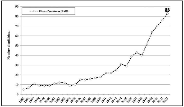 - Les études d’échantillon génétique et les observations entre la France et l’Espagne en 2023 indiquent qu’il y a 18 individus exclusivement repérés en Espagne et 35 exclusivement en France.