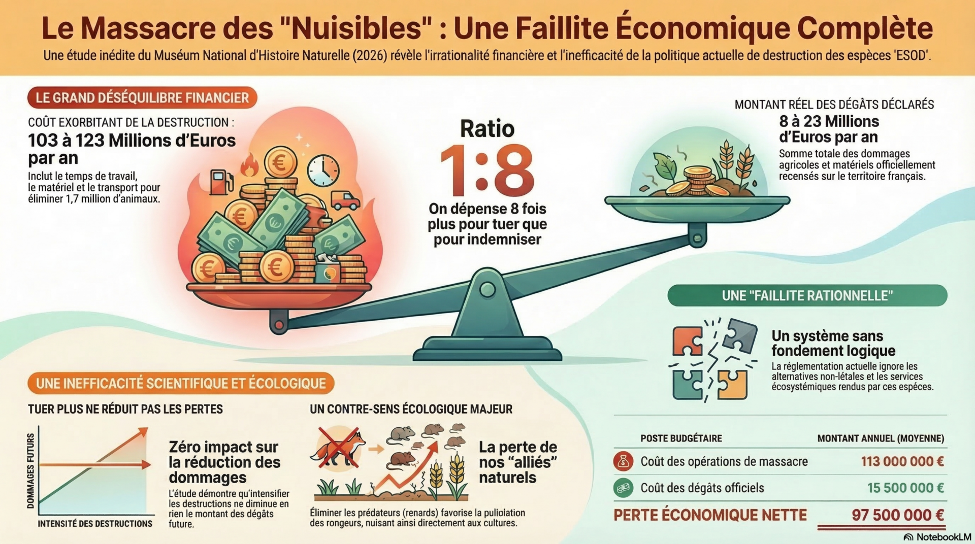 Aujourd’hui, une étude inédite du Muséum national d’Histoire naturelle (MNHN), publiée le 9 mars 2026 dans la revue Biological Conservation, vient enfin nous donner raison en démontrant scientifiquement l’inefficacité totale et l’aberration économique de cette politique de destruction, mais qu’elle aussi éthiquement injustifiable.
