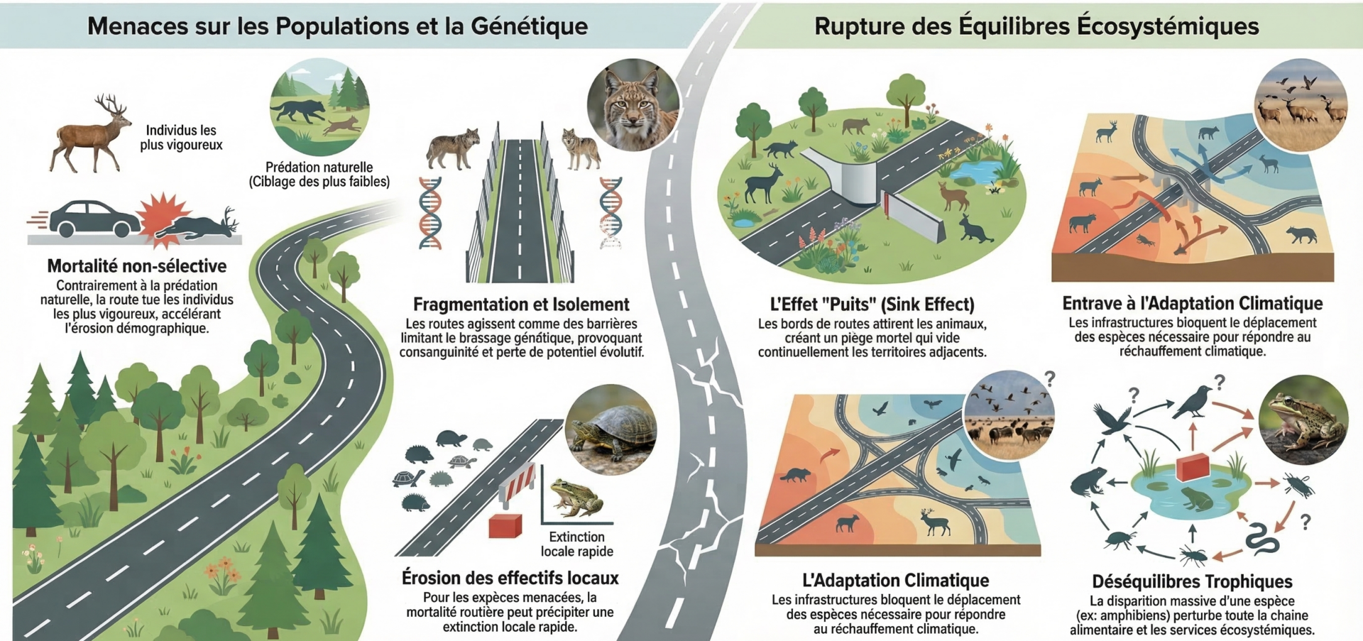 - Un prélèvement aveugle : Contrairement à la prédation naturelle qui cible les individus faibles, la route tue indifféremment les individus les plus vigoureux, accélérant le déclin démographique.