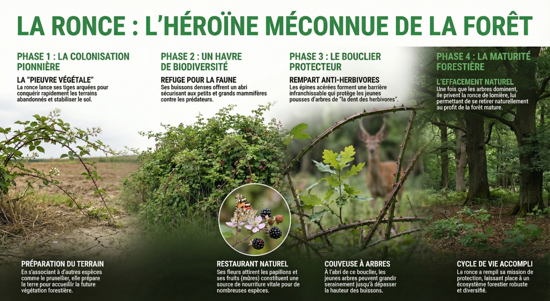 AccompagnĂ©e d’autres espĂšces pionniĂšres comme le prunellier ou le genĂȘt, la ronce prĂ©pare le terrain et accĂ©lĂšre la dynamique forestiĂšre. Ă l’abri de ces Ă©pines, les jeunes arbres peuvent grandir en toute sĂ©curitĂ©. Petit Ă petit, ils finissent par dĂ©passer les ronces, les privant de lumiĂšre, et la forĂȘt reprend ses droits.